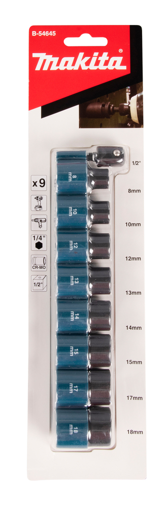Набор ударных торцовых головок 1/2" 9 шт. (8, 10, 12, 13, 14, 15, 17, 18 мм, адаптер) Makita B-54645 1/2\" 9 шт. CR-MO